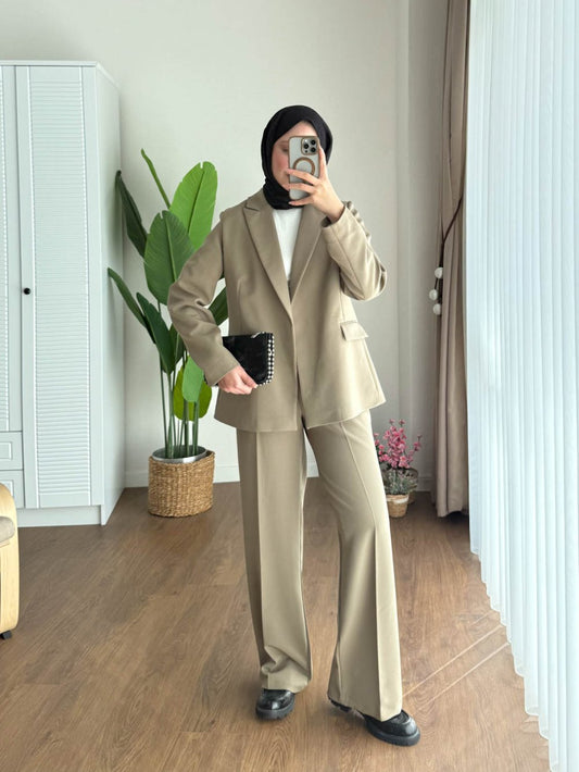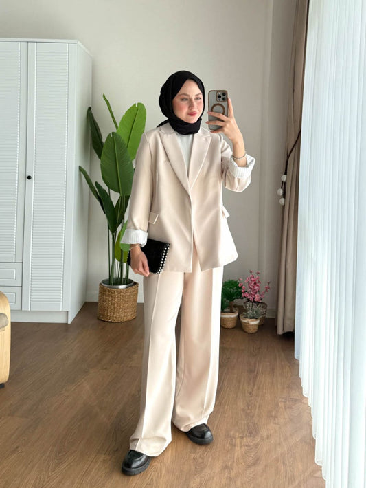 3 AL 2 ÖDEÇizgili Astarlı Double Ceket Bej