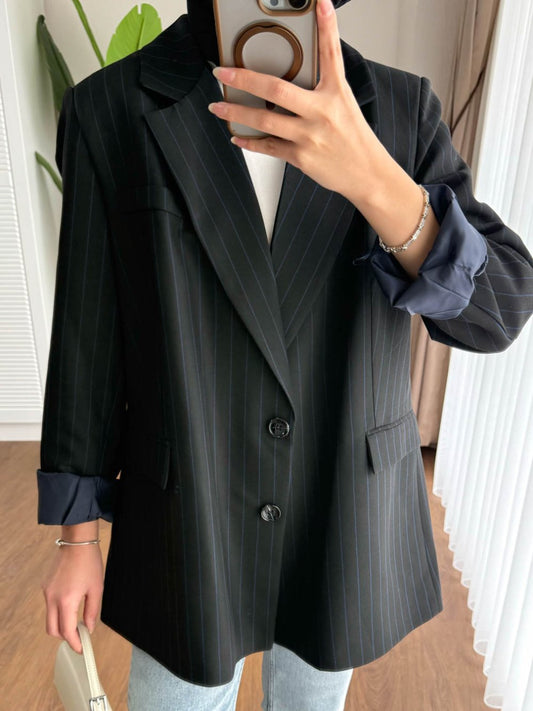 3 AL 2 ÖDEOversize Çizgili Blazer Ceket Siyah