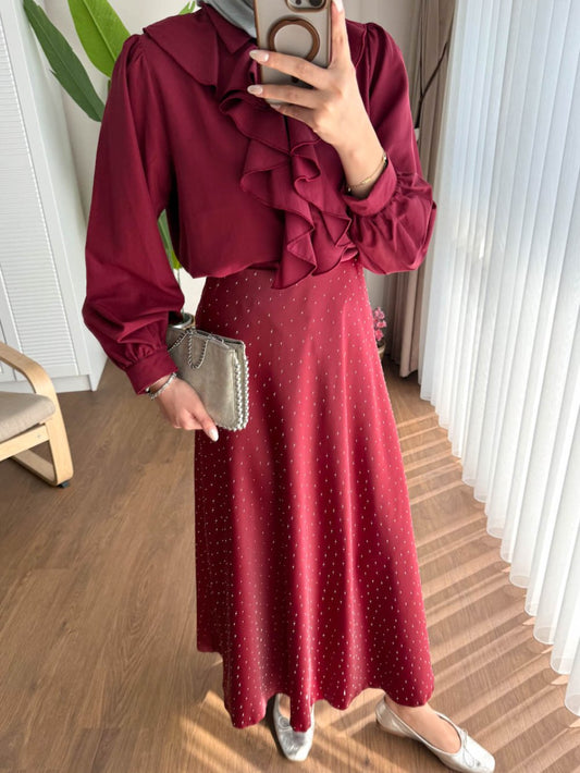3 AL 2 ÖDETaşlı Saten Etek Bordo