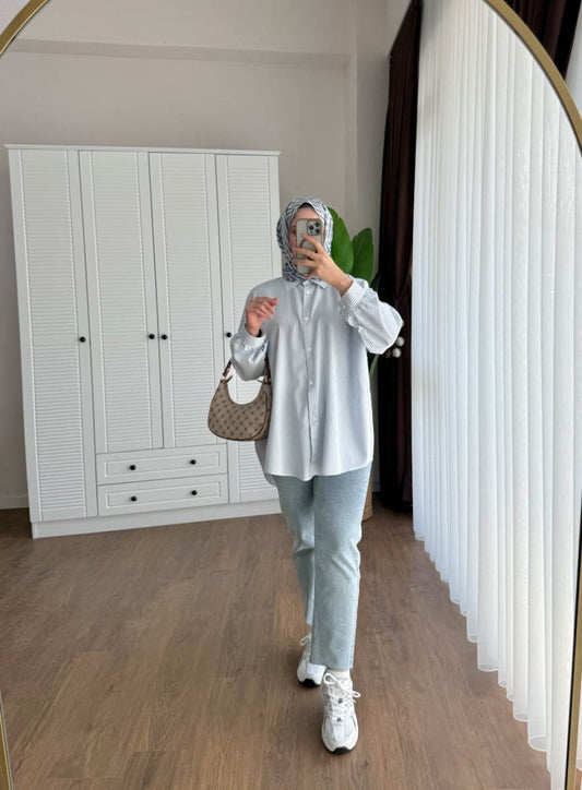 3 AL 2 ÖDEÇizgili Oversize Gömlek Mavi