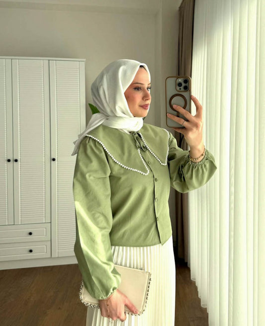 3 AL 2 ÖDEİnci Yakalı Kısa Gömlek Çağla Yeşili