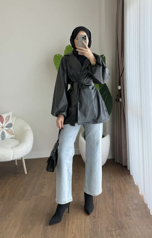 Balon Kol Beli Kuşaklı Deri Trenç Siyah