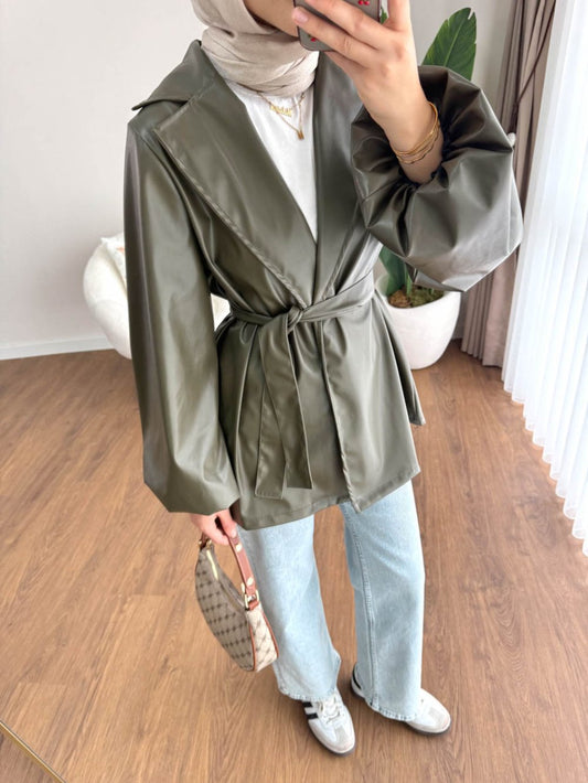 Balon Kol Beli Kuşaklı Deri Trenç Haki