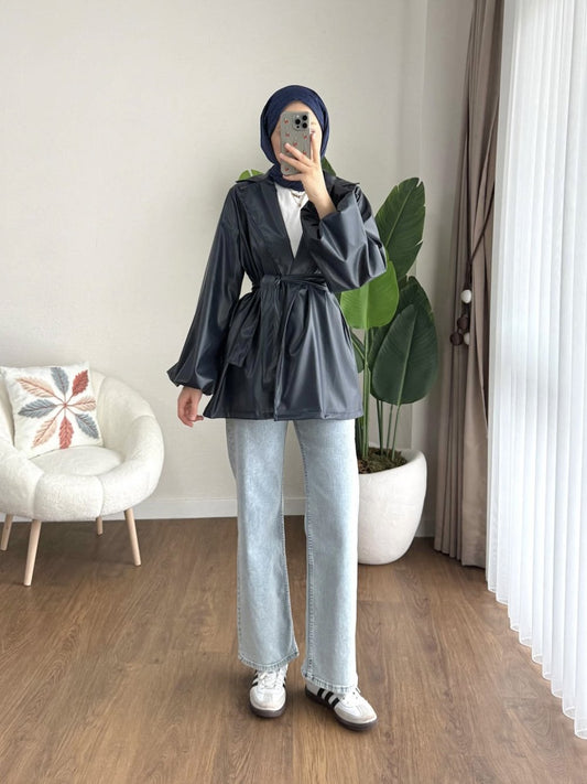 Balon Kol Beli Kuşaklı Deri Trenç Lacivert