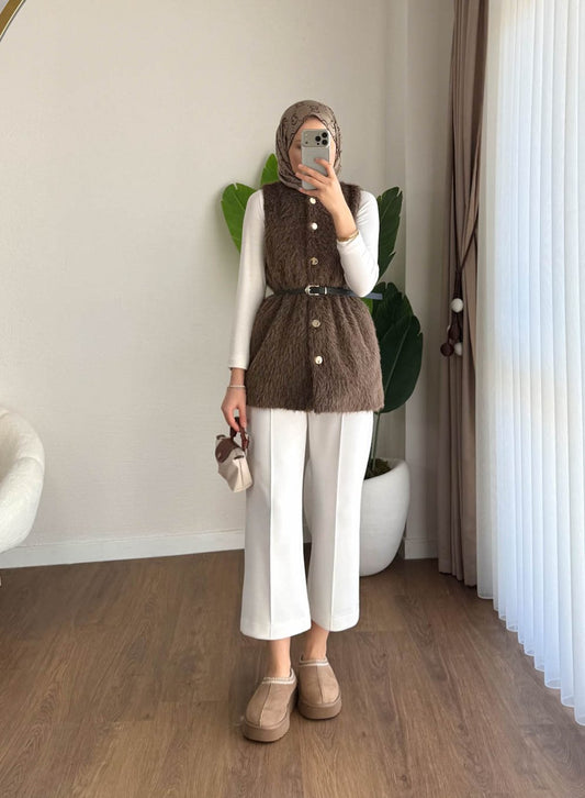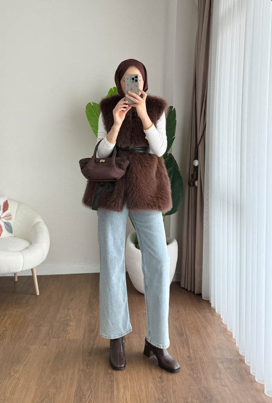 3 AL 2 ÖDEkemerli Tay Tüyü Yelek Kahverengi